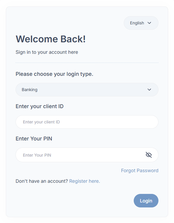 At the top of the login form, users can select their preferred language from the dropdown menu. They then choose their login type, with two available options to access different account categories.